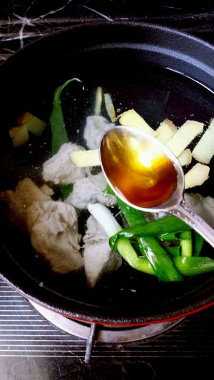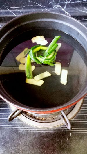 汤锅一次倒入足够量的水,放入姜和葱,盖盖大火烧。 我倒了约1200毫升的水。