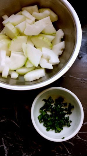把食材切好(按照计划量自行准备食材用量即可,灵活掌握哟)山药切段、胡萝卜滚刀切块、冬瓜切稍厚的片、准备好小嫩葱切碎。