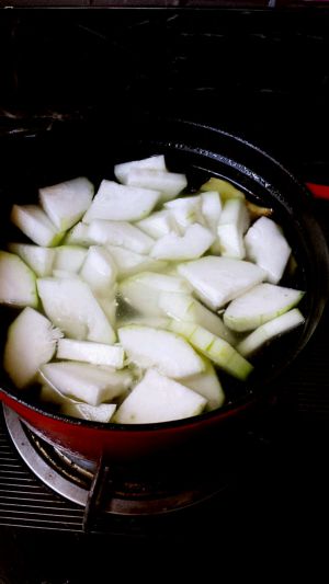 一小时后放入冬瓜,盖盖大火煮开,小火炖至冬瓜透明,大约15分钟