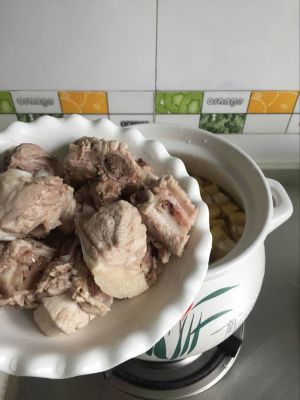 另起一锅倒入水,排骨入凉水焯水,焯好后捞出用温水洗净。这时上一步汤锅烧的水已经温热,把洗净的排骨放入汤锅里