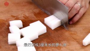 白萝卜1根,刨皮后去头去尾,先切段,再把四周整平,切成2厘米宽的萝卜条,最后切成3厘米长的萝卜块,宽、厚跟打火机接近,萝卜块每块约2钱,共12块;