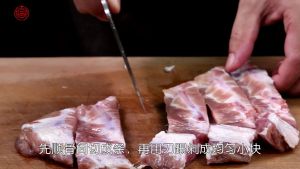 排骨洗净。冷水中加入葱姜蒜、少许料酒等去腥调料,煮开后放入排骨,煮至肉变色即可,捞出沥干备用。
