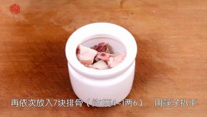 萝卜块依次放入大汤杯中,再依次放入7块排骨(约1两4~1两6),用筷子扒平,取1量杯,倒入220毫升清水,将220毫升清水全部倒入汤杯中,用筷子扒平,加入盐3克,两片小姜片;