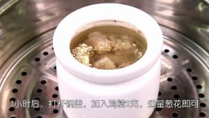 蒸锅水开上气,用夹子将汤杯夹入蒸锅中,盖上锅盖,大火蒸1.5小时,1小时后,打开锅盖,加入鸡精2克,适量葱花即可;