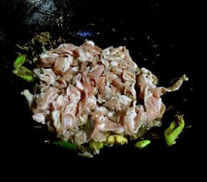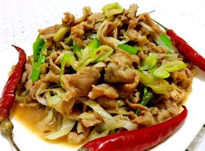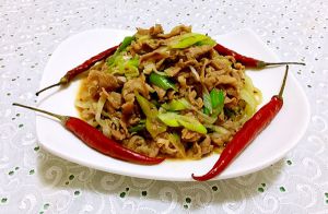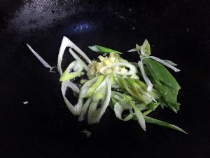 放入圆葱蒜,辣椒。出香味后放入羊肉。盐。味精。料酒。翻炒,肉很快会熟,然后放孜然,出锅。