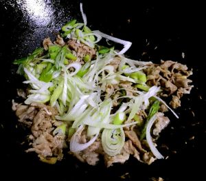 大火快速翻炒羊肉变色,将葱放入锅中一起翻炒均匀,(葱我喜欢多放一些,和羊肉一起炒味道特别好吃)这时要放入盐入味最后放味精提鲜即可