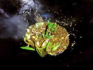 出锅前加入盐 孜然粉 味极鲜酱油翻炒