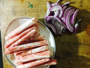 洋葱切丝、大葱切末、辣椒切小段,准备好羊肉卷