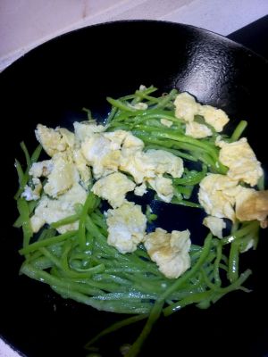 炒致断生倒入炒好的鸡蛋,放少许鸡精拌匀即可。
