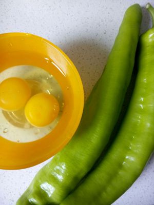 青椒去蒂,籽洗净。鸡蛋打入碗中。