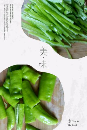 青椒用刀从中间破开,切段再切成丝。