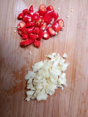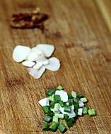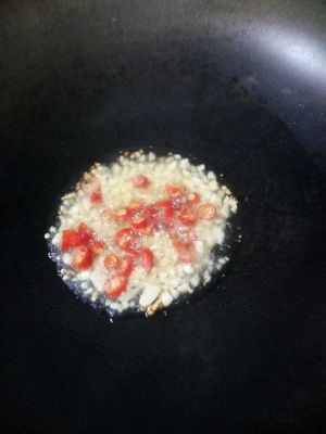加入少许油,烧热后加入蒜和辣椒炒出香味,加入一半的包菜,翻炒均匀