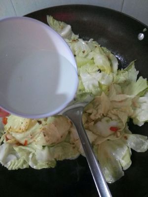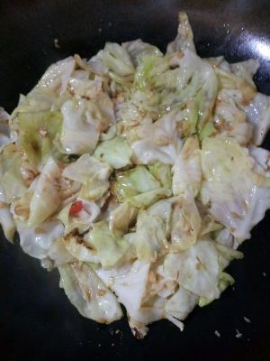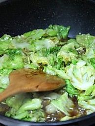 加入海鲜酱油2勺,耗油1勺,白糖半勺。盐和鸡精少许,翻炒均匀。待锅中的包菜变软后,倒入剩余的包菜翻炒。等所有包菜都变软后出锅即可