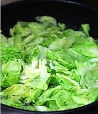锅内注入适量清水,大火烧沸后保持沸腾状态,把包菜倒入焯水30秒,捞出沥干水分