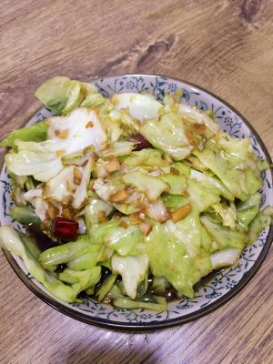 热油炒香葱花蒜沫 倒入包菜翻炒 撒入辣椒碎 加一些醋 糖 盐 鸡精 翻炒变软就可以关火了 撒入些蒜沫出锅