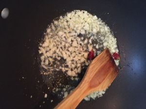 加入蒜末、干辣椒和花椒,翻炒出香味