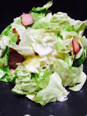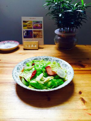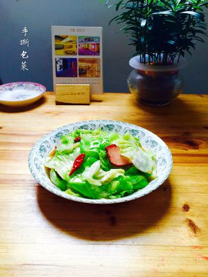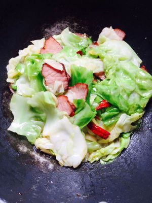 干辣椒微炒变色,倒入包菜,加入适量盐、蒸鱼鼓汁、大火翻炒。