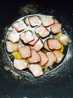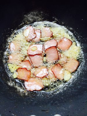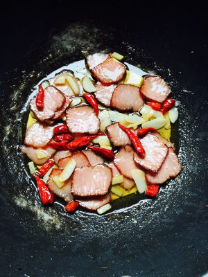 腊肉炒至微焦黄时,放入姜、蒜片。