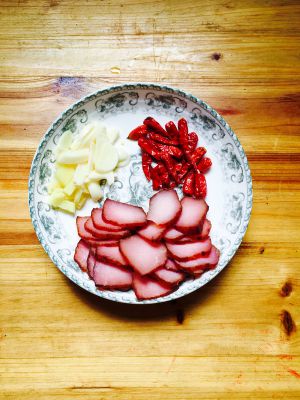 腊肉切薄片,姜切小片,蒜子切片,干辣椒洗净。