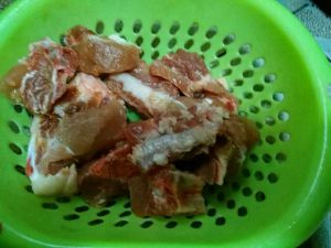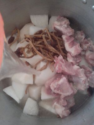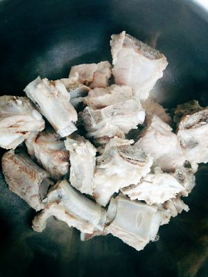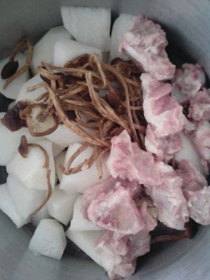 茶树菇干剪掉根,在泡在水中5分钟。排骨用温水清洗后抓粉放三勺盐一勺油。白萝卜削皮洗净切大块。锤一饼姜。放入高压锅中。