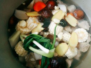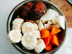 玉米切段,白萝卜,胡萝卜切块,香菇洗净备用