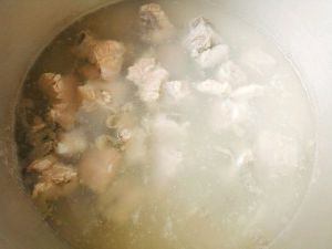 把炒制好的排骨和生姜加入到煮开的黄芪党参汤中,加入3g冰糖,盖上高压锅盖,大火煮至上大气后10分钟后,转小火煮5分钟后熄火。