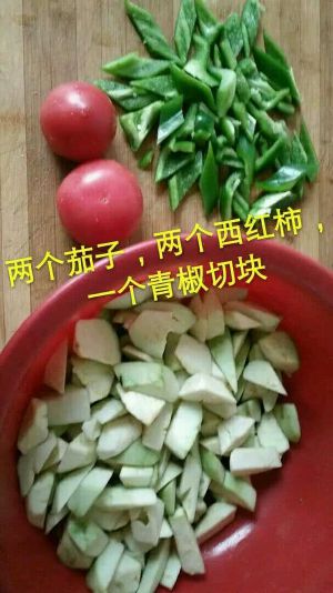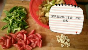 将茄子、辣椒、西红柿切块,葱姜蒜切丝备用,糖、盐、生抽调汁。