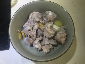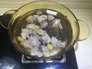 排骨洗净,锅中入冷水,加入两片姜片,两勺料酒。把排骨放入锅中,直至煮沸。