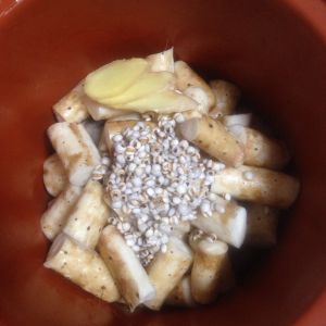 加入山药、洗净薏仁、姜片