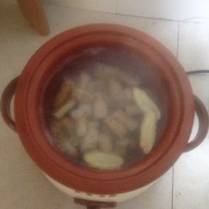 将猪排骨用清水洗净,放入开水中煮变色,捞出。砂锅中放入足够多的水,将焯好的排骨和姜放入,烧开,转小火煲至排骨酥烂,大约40分钟。