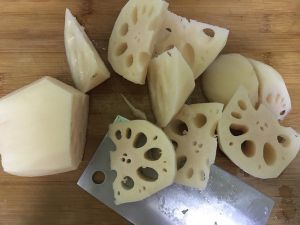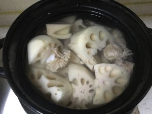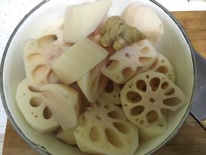 将排骨 莲藕 姜放入砂锅中加入足够的冷水
