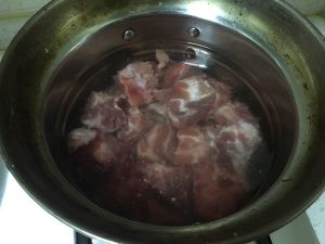 将排骨洗净剁成小块,凉水下锅,开锅吐出血沫后捞出待用。