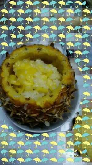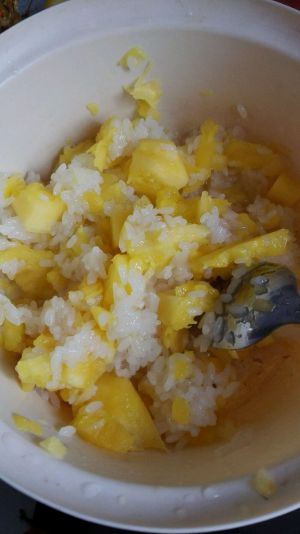 把挖出来的菠萝放在盐水里浸泡会,和上刚煮好的糯米饭,搅拌均匀。其实当中少了个步骤,姐忙着赶紧吃菠萝饭,懒的拍照了,各位妹子就是用你们那白嫩的小手,随便抓两把糯米,洗干净,放一点点水,糯米放在碗里,水只要没过糯米一点点就好啦,不能把糯米暴露在外,放在蒸锅上蒸半小时,这样煮出来的饭软香糯。