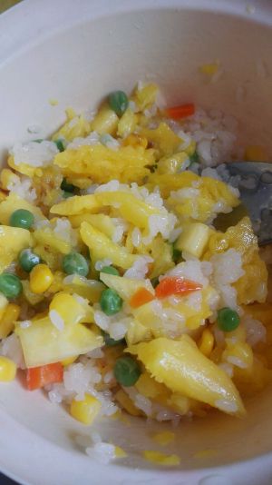 这是加了青豆玉米胡萝卜丁搅拌后的样子,括弧,这个丁姐超市买的现成的,超市专门有卖叫杂菜,炒个饭什么的都可以放点哈嘿嘿,懒人必备。对了,忘记说了,糯米饭好了立马和菠萝搅拌,外加两勺子白糖,你可以一边加一边尝味道,姐的尝了,非常好吃,香甜可口,不酸。姐没忍住偷吃了好几楼。