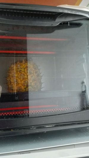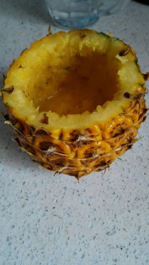 把整个菠萝切掉顶,剩下的部分挖空,这个挖空要小心哈,不要挖穿,我挖,我挖,我挖挖挖。。。