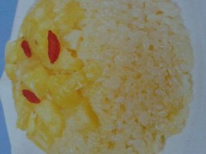 大米淘干净,用橄榄油,盐,咖喱粉制成的汤汁拌均,菠萝去皮洗干净,将菠萝切成小快,在盐水中浸泡1分钟捞出备用!