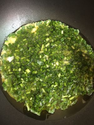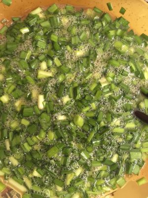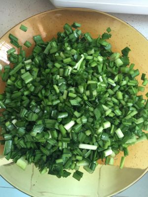 韭菜剁碎。加入鸡蛋和盐搅拌均匀。