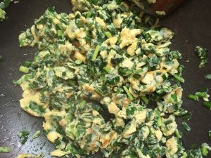 锅里上油烧热,倒韭菜鸡蛋入过翻炒