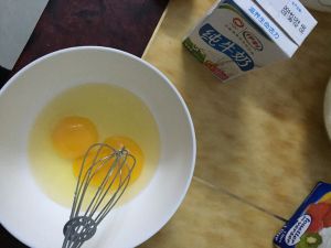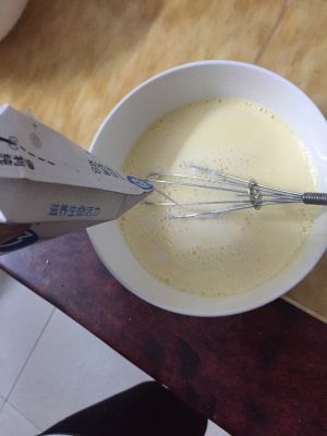 将纯牛奶250亳升加入3个鸡蛋再加入适量糖小朵,搅拌均匀过滤一下