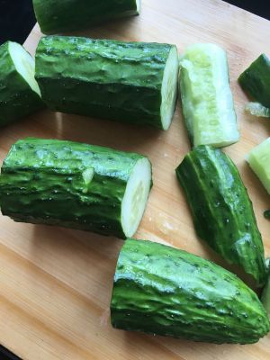 黄瓜再切成段,用力拍,一段拍成四瓣