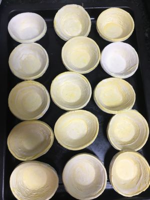 擀好的面皮放进磨具中,底部要按的薄一些。然后沿着磨具边捏一圈。(底薄才酥)然后醒20分钟左右。接下来做挞水。
