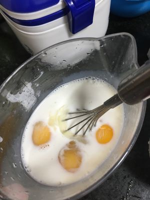 鸡蛋打散搅匀(我用的是两个半鸡蛋,早上用剩下一个蛋黄也加入其中了)