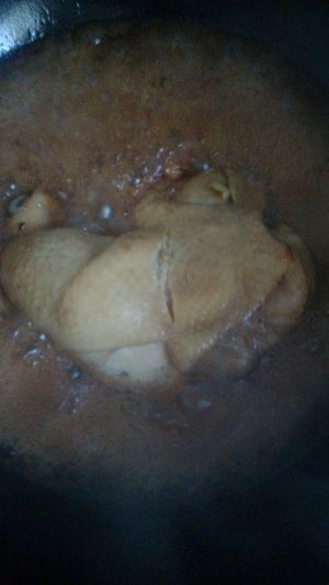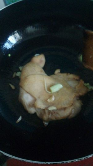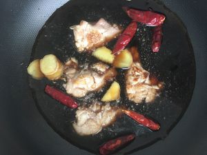 热锅凉油,蒜姜下锅爆香,然后放入鸡腿
