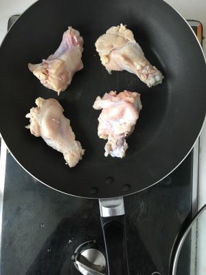 葱切段,姜切片,锅中倒油,等油热后酱鸡腿放入锅中煎至鸡腿变色,放入葱,姜,翻炒片刻,炒出香味。