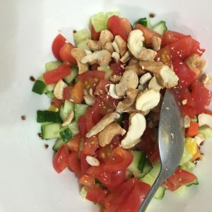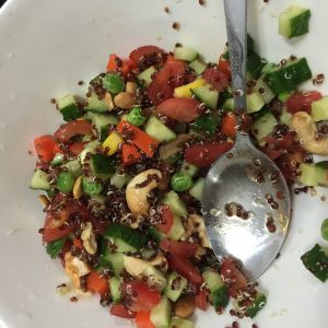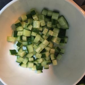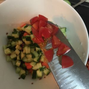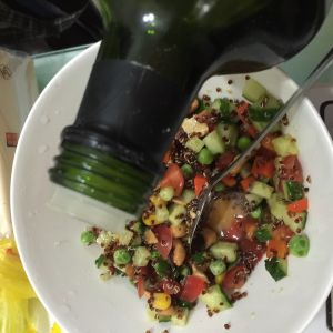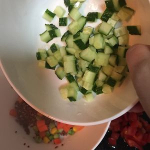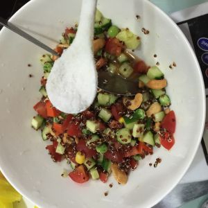 古斯米色拉 : 古斯米和盐放入一个大碗内。将滚鸡汤倒入碗中,盖上保鲜膜静置 20 分钟。把暖的小米加入甜椒及青瓜,再加入柠檬汁连皮蓉、薄荷叶、黑胡椒碎。加入初榨橄榄油,用叉把非洲小米搅拌,放入冰箱备用。