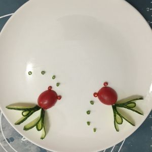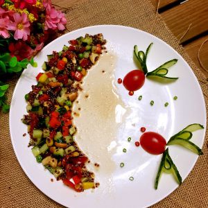 将小米色拉放入碟中,放上鸡腿及鸡胸,以圣女果装饰即可。