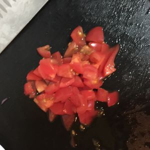 3、腌渍半小时左右的三文鱼表面鲜红的肉质部分变白的即可。将橄榄油均匀涂抹在三文鱼表面。这个步骤不要省略,此操作可避免鱼肉粘锅底。