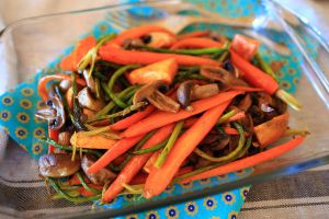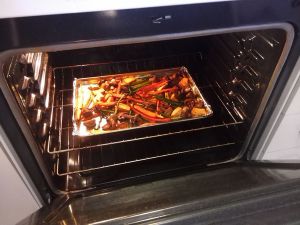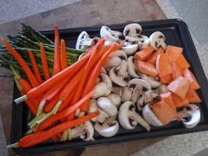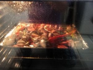 将蔬菜放在大盆里,倒上橄榄油,拌均匀,太多的话,可以分次操作,然后将蔬菜倒在烤盘上。均匀撒上细海盐粒,一般盐也可以,再撒上鲜磨的黑胡椒碎。