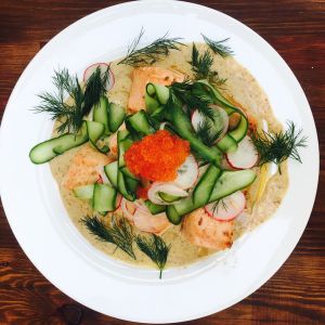 5、容器内淋芝香沙拉汁,降煎好的三文鱼肉摆盘。撒上腌好的瓜片、洋葱、萝卜。配上茴香头、黑胡椒粉。最后点缀鱼籽酱。大功告成。