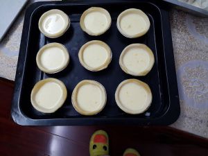 把蛋液灌满塔皮,放入烤箱中层,180度,上下管,30分钟,各人烤箱温度不一,烤的时候要勤观察上色情况